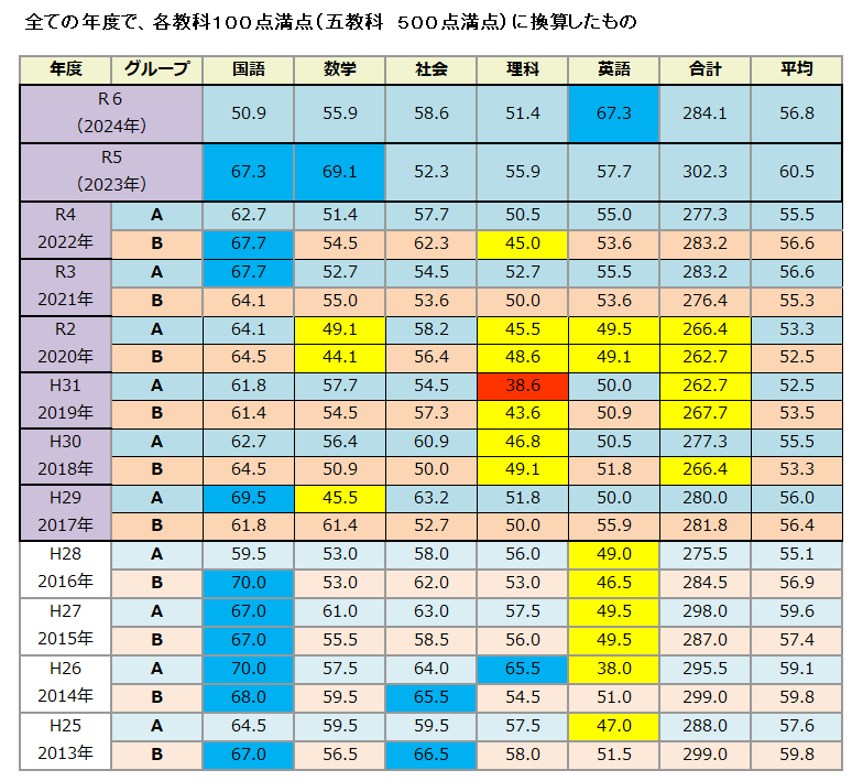 過去12年分で、各教科の満点を100点、五教科合計の満点を500点に換算してみると・・・