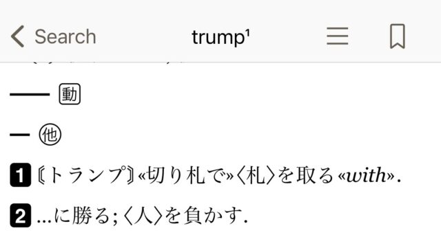 で、トランプするってなんだ?ってなるのですが、先程の名詞では切り札の意味でしたが、動詞になると、(切り札を使って相手に)勝つ、打ち負かすの意味になります。