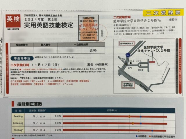 本日、英検協会から、英検の一次試験の結果が郵送で届きました。