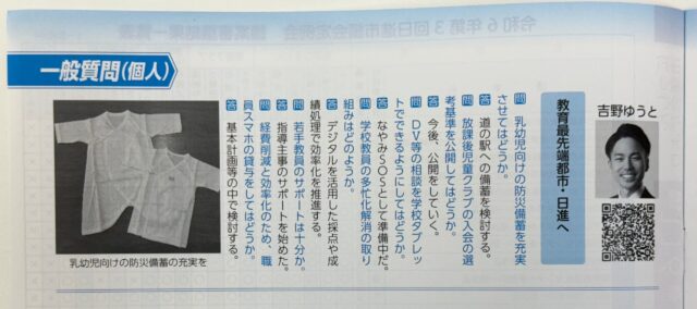 塾に届いていた日進市議会だよりに、9月議会での吉野先生の質問が掲載されていました。