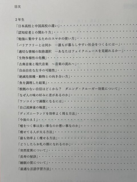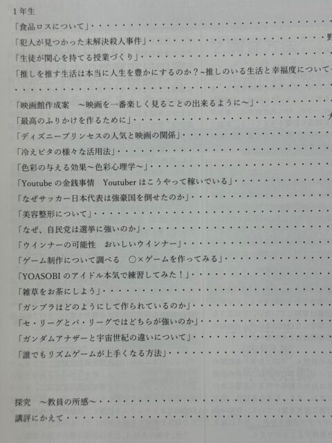 しかし、目次に並んでいる研究テーマはどれも個性的で、もちろん中には研究というにはどうかと思うテーマも散見されますが、読んでみると生徒がしっかりテーマと向き合ってきたことがよくわかり、どの研究内容も素晴らしいものでした!