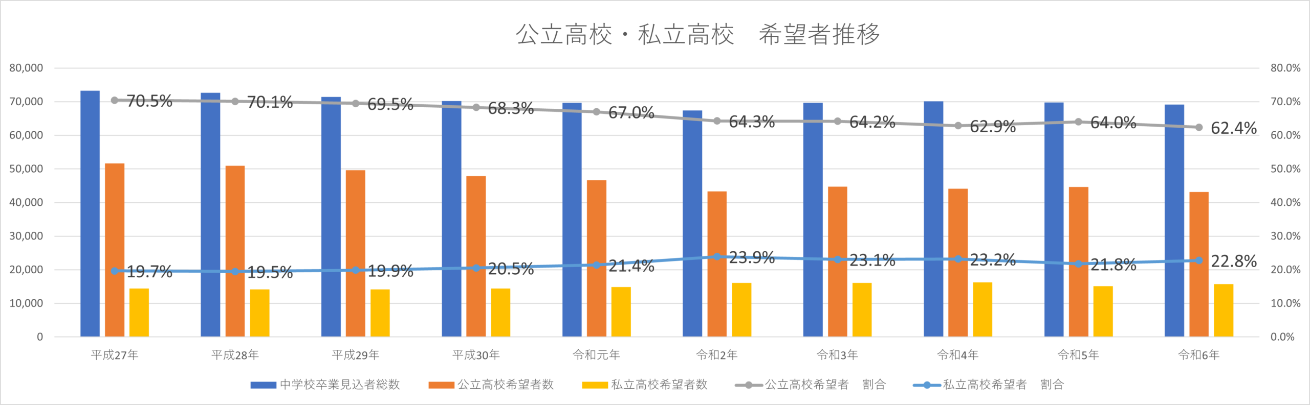 率にすると1.1%の増加ですが、過去一貫して公立高校希望者が下がり続けてきた現状を考えると公立高校離れにも少しだけブレーキが掛かったようにみえます。