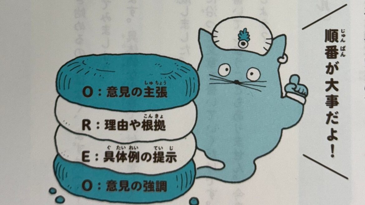 「OREO」の作文の型は、英語圏の小・中学校などで主張や意見を簡潔にまとめる練習としてよく使われるフレームワークで、次の4つのステップから成ります。