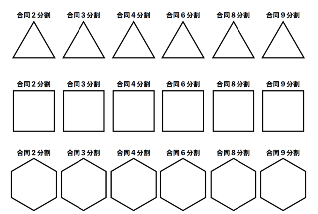 正三角形、正方形、正六角形を合同に2分割、3分割、4分割、6分割、8分割、9分割する問題です。