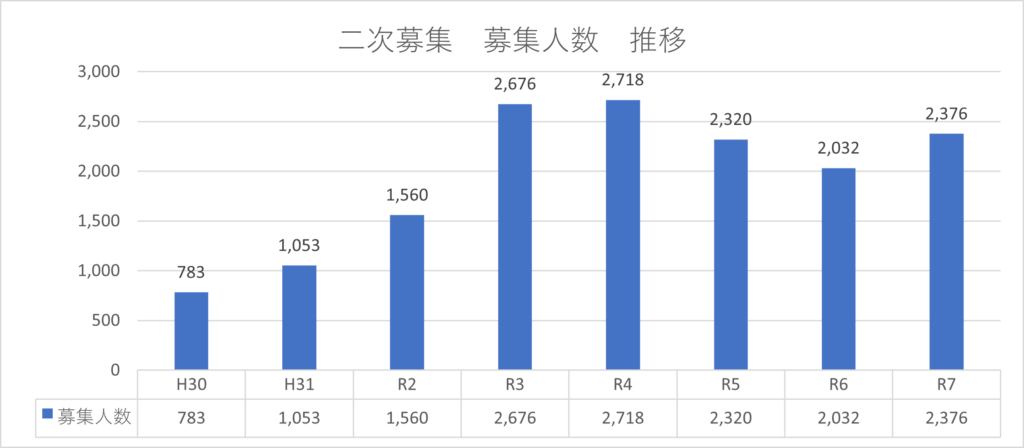 2次募集人数については、4年前一気に1.7倍増え翌年も微増しましたが、その後やや減少傾向となっていました。