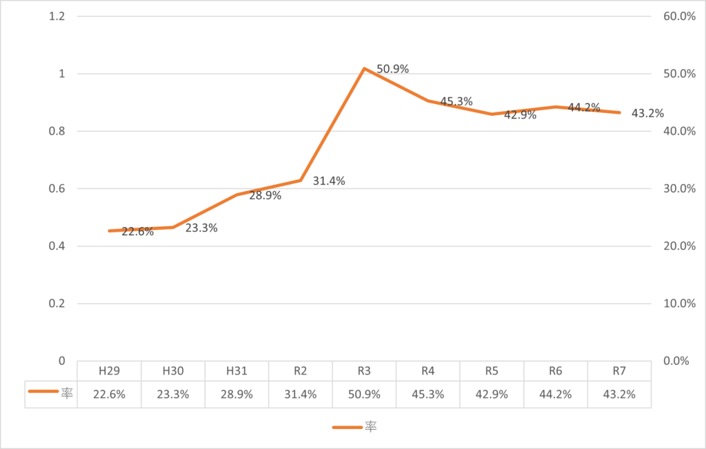 4年前、一気に50%を超えたものの、その後は減少し、すこし落ち着いてきた感じです。