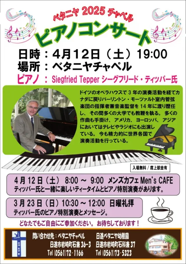 4月12日(土)には、ピアニスト(Siegfried tepper)のコンサートがベタニア教会で行われます。
