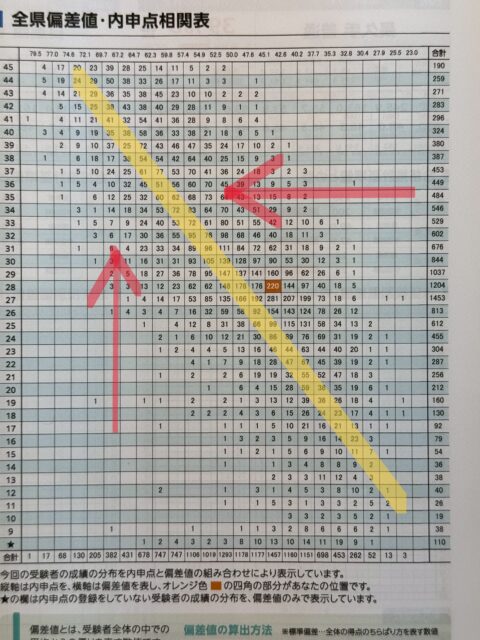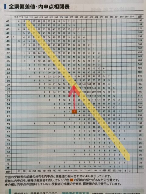 注目してほしいのはこちらの「全県偏差値・内申点相関表」です。