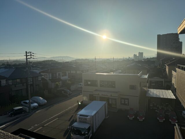 日の出から1時間半も経つと、塾の外もこんな感じで、東に昇った朝日が眩しくて夏のようで、今日も暑くなりそう!