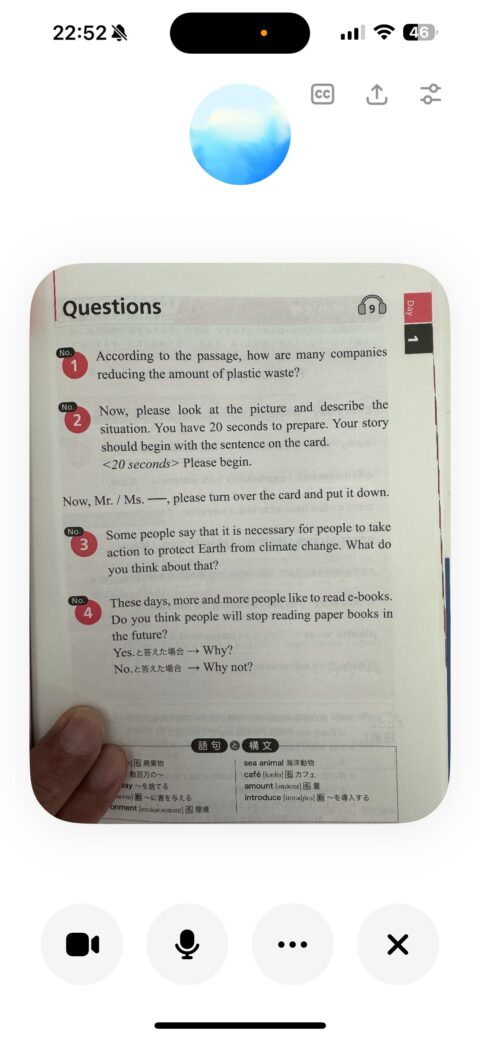 こんな感じで、ChatGPTのアドバンス音声モードに、英検二次対策の本にある面接カードと、質問を写真で送ります。