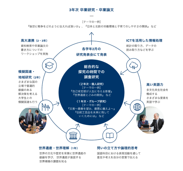 この高校の国際探究コース(今後は世界探究科と変更予定です)では、以下の通り1年はグループ研究、2年3年と個人研究が行われます。