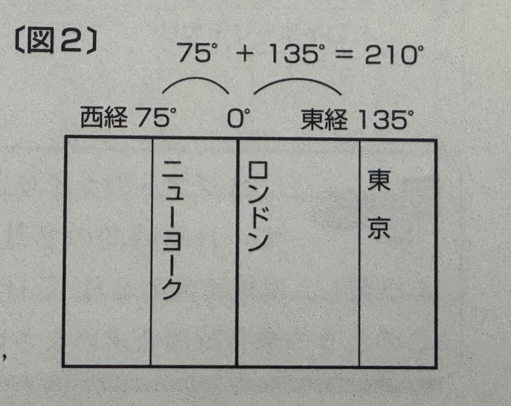 ニューヨークは、西経75°なので、75÷15=5 で、ロンドンからさらに5時間遅れるため、日本からは9+5=14時間遅れているのが一目でわかります。