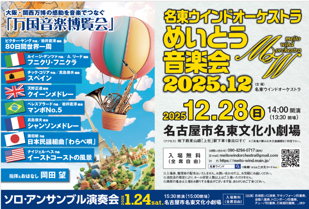 2025年、大阪・関西万博の熱気に包まれた一年。 クラシックから民族音楽、そして心躍るリズムまで、 ご家族そろって、音楽で世界旅行をするようなひとときを。 —————————- 指揮とおはなし 岡田 望 —————————- 80日間世界一周 ビクター・ヤング作曲/岩井直溥編曲 |