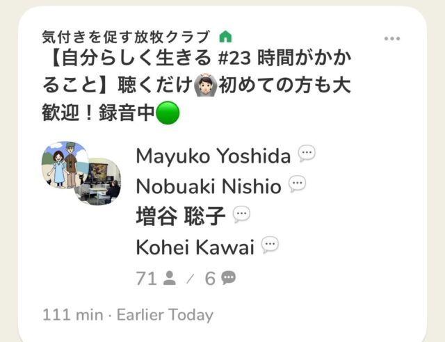 今朝は月曜恒例のClubhouseのコーチング部屋でした。「時間がかかること」についてみんなで考えました!