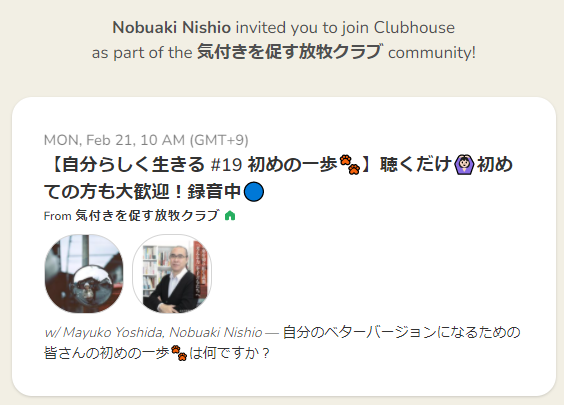 昨朝は月曜恒例のClubhouseのコーチング部屋でした。「はじめの一歩」についてみんなで考えました!
