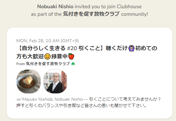 今朝は月曜恒例のClubhouseのコーチング部屋でした。「引くこと」についてみんなで考えました!