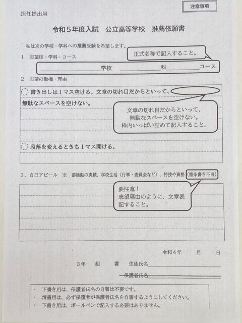 方眼ノートを使って、推薦依願書の作成に挑戦しています。