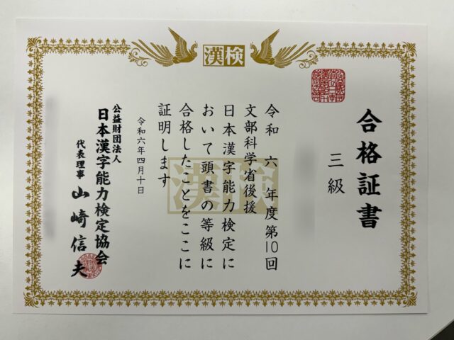 新中3生がリベンジしてくれた漢検CBT3級の結果が届きました!