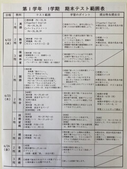 日進西中学校 1学期期末テストまであと2週間!試験範囲表が配られましたね!