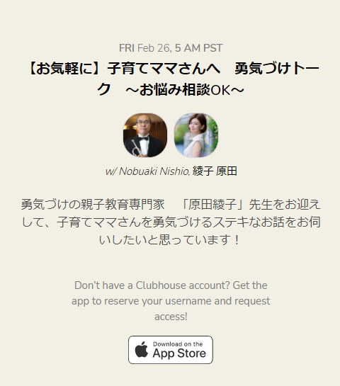 Clubhouse トークライブ 「子育てママさんへ 勇気づけトーク」無事 終了しました!
