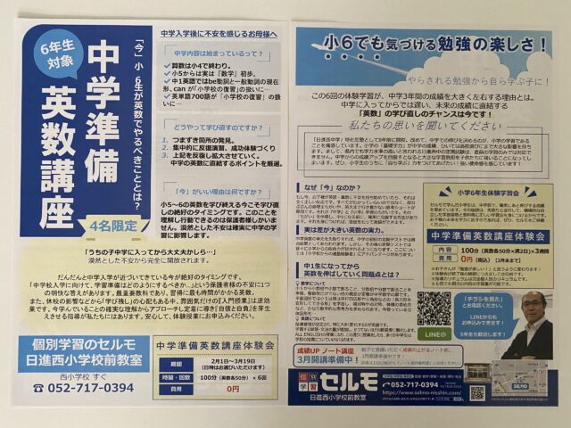 日進市で、主に日進西中学校の生徒を中心に、生徒みずから主体性を持って学び、自分のペースで勉強できる、ICTを活用した学びの場を提供している、セルモ日進西小学校前教室 塾長の西尾です。 今日は、中学準備講座のご案内です。 日進西小学校 ... -