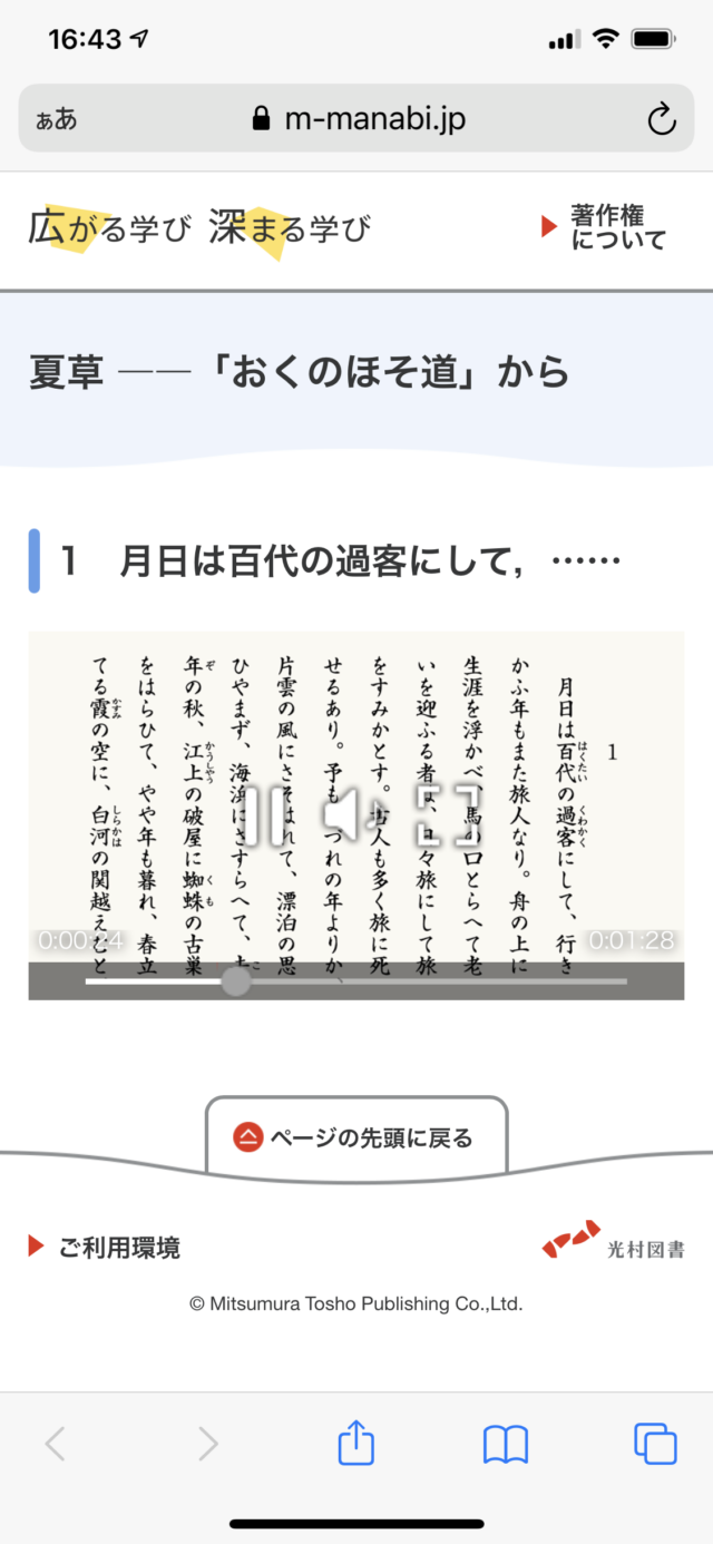 こちらは、中3の暗唱の定番である「おくのほそ道」のQRコードを読み取った画面です。