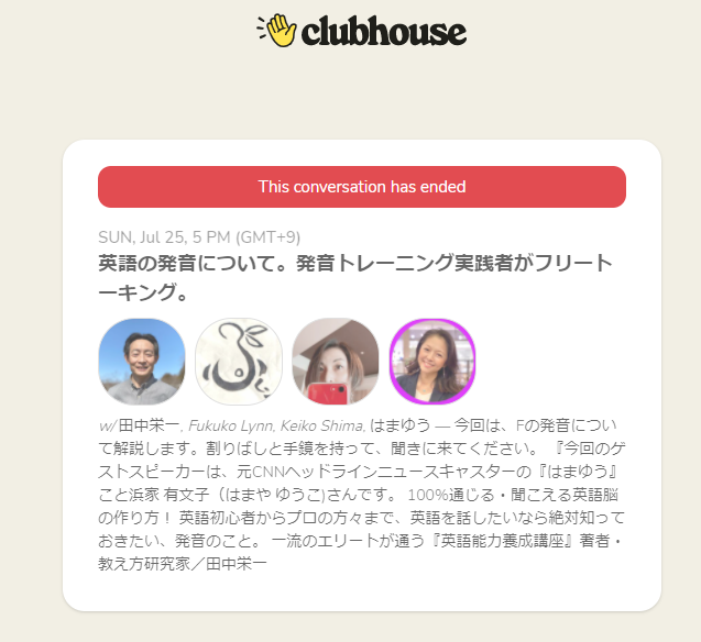 今日は、Clubhouseで活躍中のもとCNNキャスター「はまゆう」さんこと浜家有文子さんと、彼女が最近ハマっている発音のトレーニングの先生である田中先生が中心に発音のトレーニングを行う部屋に飛び込んでみました。
