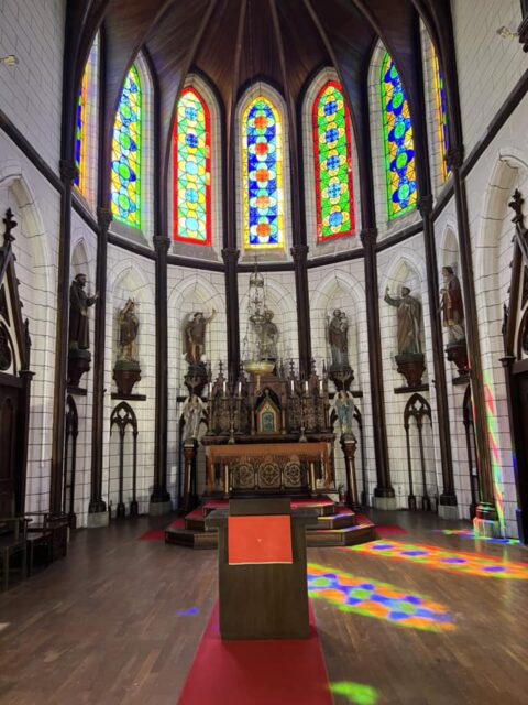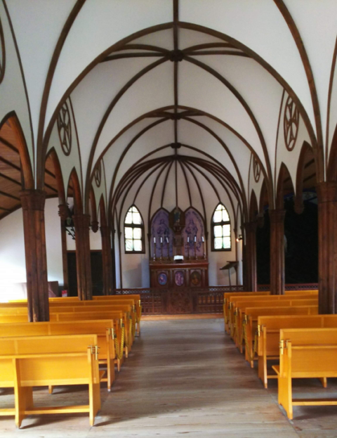 農家のような作りの外観とは打って変わって内部は木造で作られた西洋ゴシック様式の美しい教会です。